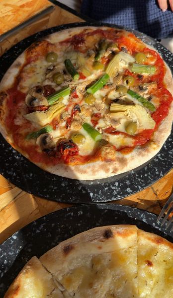 Elysia had the Stagioni Pizza with Artichokes, Asparagus and Olives and we all also shared pizza garlic bread and courgette fries, both perfect for the table.